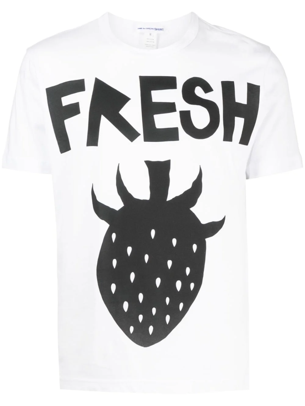 strawberry-print cotton T-shirt white/black cotton graphic print to the front round neck short sleeves straight hem Imported Composition Cotton 100% SIZE & FIT Model measurements Height 6 ft 2 in(1.88 m) Bust/Chest 31.88 in(81 cm) Hips 35.82 in(91 cm) Waist 27.55 in(70 cm) FittingInformation Designed to be unstructured, offering a loose fit throughout Made from a midweight non-stretch fabric, this piece offers minimal elasticity when worn This piece fits true to size – take your usual size Washing instructions Machine Wash