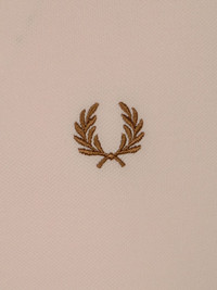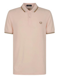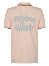 x Fred Perry slogan-print polo shirt Highlights - Pink - Striped trim - Polo collar - Button placket - Embroidered logo - Slogan print on the back - Short sleeves - Straight hem Imported Composition Outer: Fabric 100% Washing instructions Read Manufacturer Guidelines