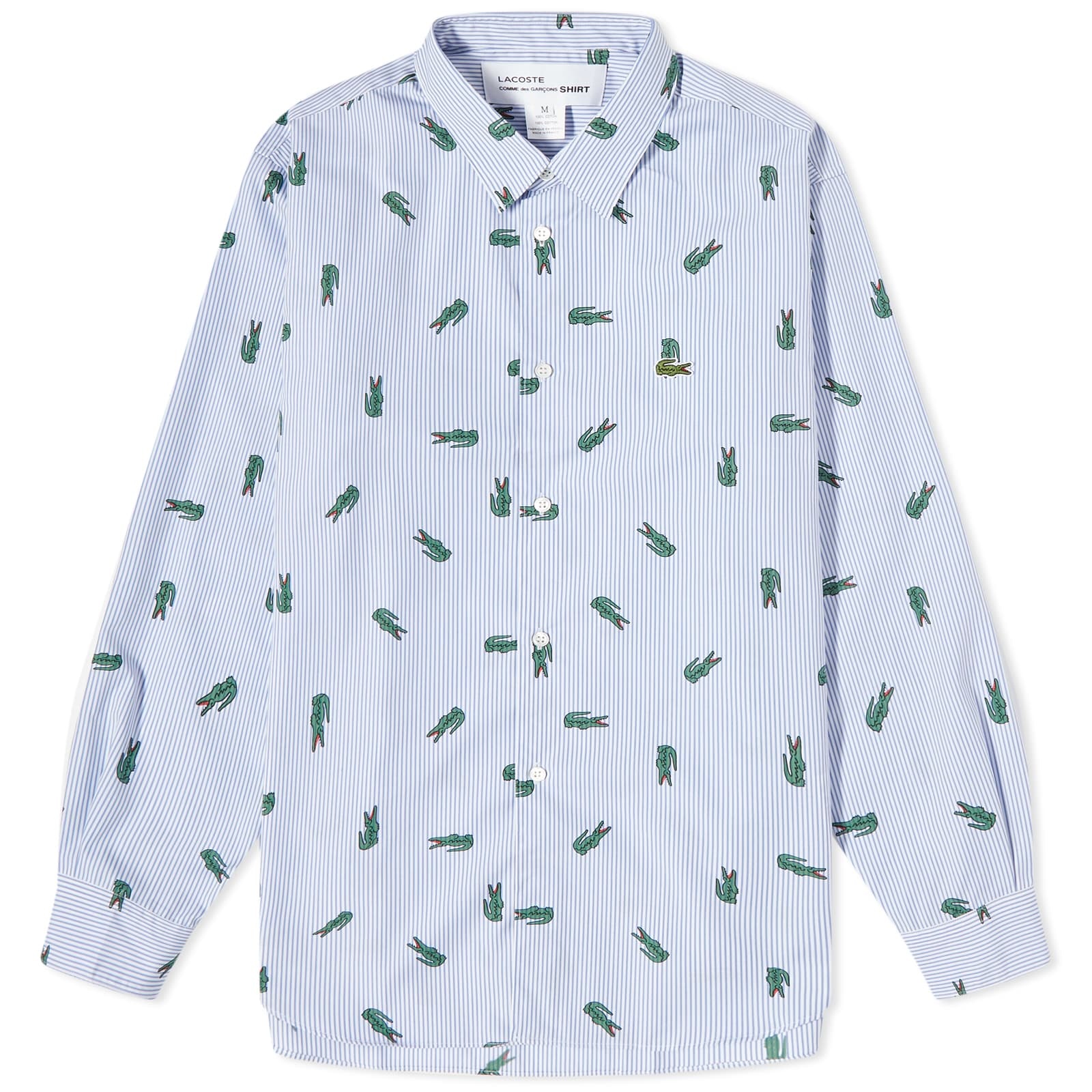 Collaborating once again, Lacoste and Comme des Garçons come together to create a new unique collection of versatile fusion. With its roots in tennis, Lacoste’s is renowned for sportswear and preppy stylings, whilst the CDG sub label is a master in the contemporary street-focused scene. Together the world of classic styling and asymmetrical detailing combine. Smart casual inspired, this shirt is crafted in France from the finest cotton. Adding a streetwear edge to a classic design, the button placket and the hem undergo an asymmetric treatment. First stitched onto Blazer’s in the 1920’s, the Croc is embroidered all over this shirt. Finished with a stripe pattern for a bold finishing touch.. - 100% Cotton - Classic Collar - Button Closure - Buttoned Cuffs