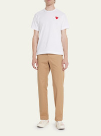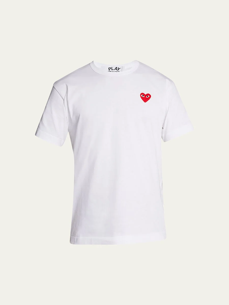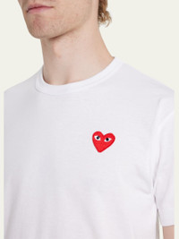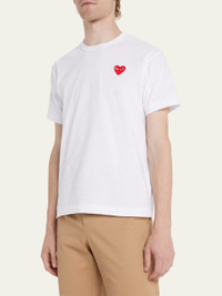 Comme des Garcons jersey T-shirt with signature heart graphic at chest. Crew neckline. Short sleeves. Pullover style. Cotton. Imported. Model is 6'1"/185cm. Online Inquiries: BGS21_N7EE6| Store Inquiries: #3623922