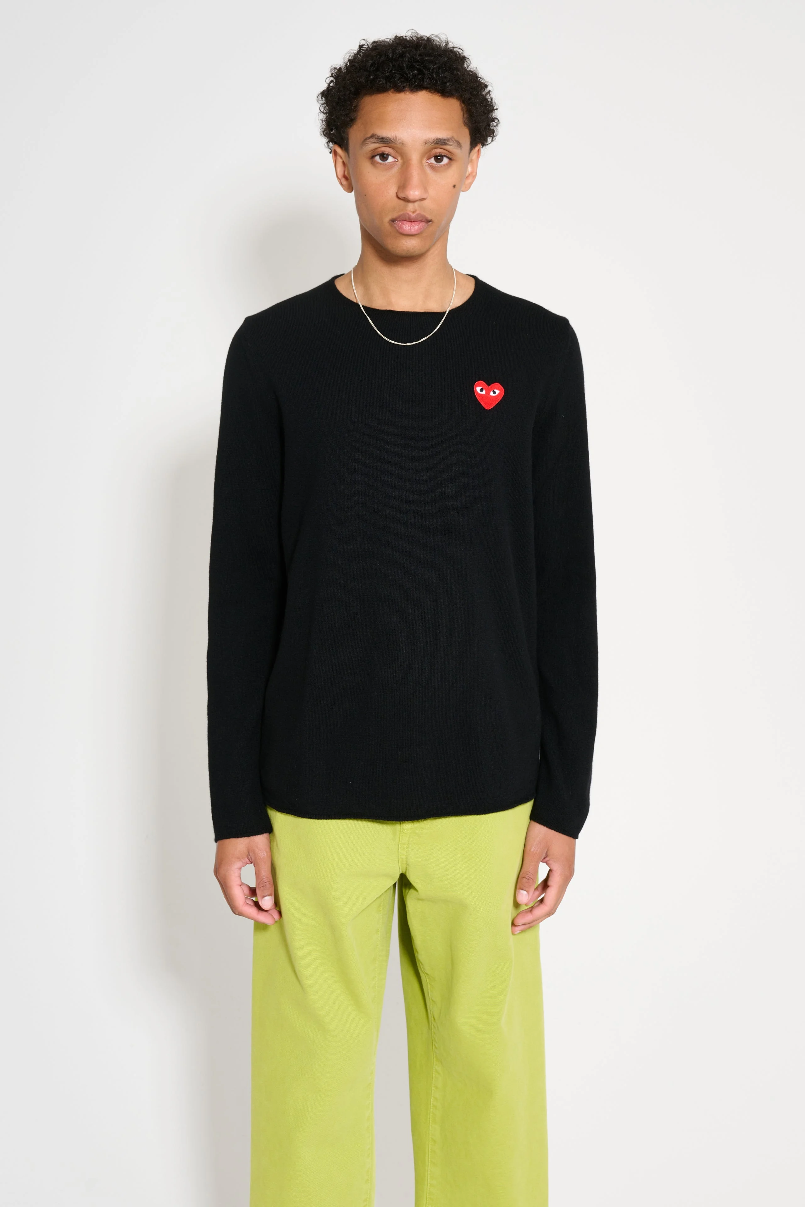 Sweater from Comme des Garçons Play. Round-neck with rolled edge, contrasting sewn-on logo patch on the chest. Ribbed cuffs and hem. Details Black sweater. Made in Japan from 100% wool. Art. No: p1n068 ART. NO: p1n068 Size & fit Regular fit. True to size. Model wears a size Large and measures 188 cm with a 93 cm chest.