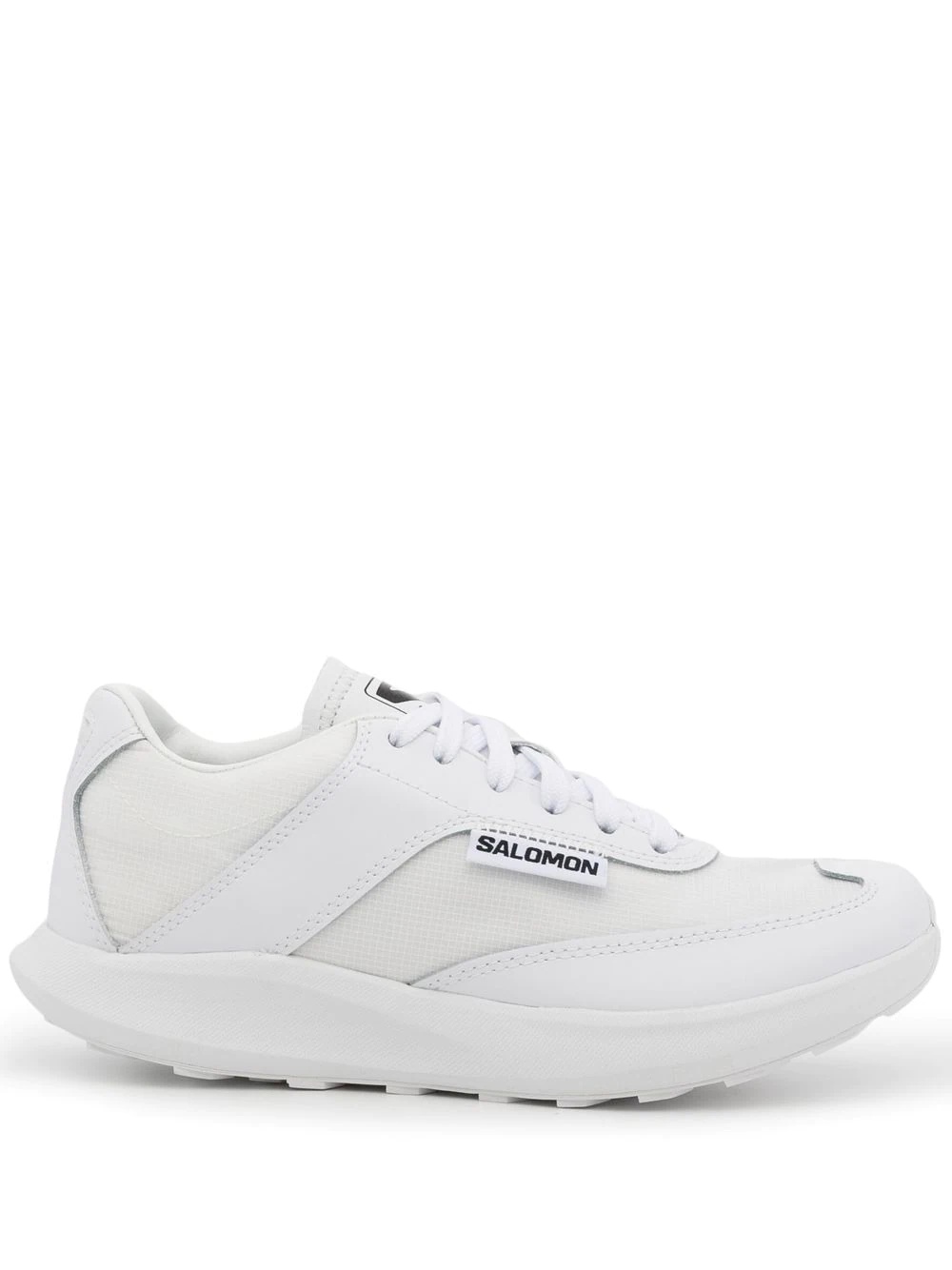 x Salomon SR90 panelled sneakers Comme Des Garçons' collaborate with the masters of athletic footwear in their collection with Salomon. Sartorially crafted in a tonal white design, these SR90 sneakers boast water-repellency and Salomon's unique Contagrip⢠sole for traction and durability. Imported Composition Lining: Leather 100% Sole: Rubber 100% Outer: Fabric 100% SIZE & FIT Measurement HEEL 9.8 in(25 cm) Sole height 0.8 in(2 cm)