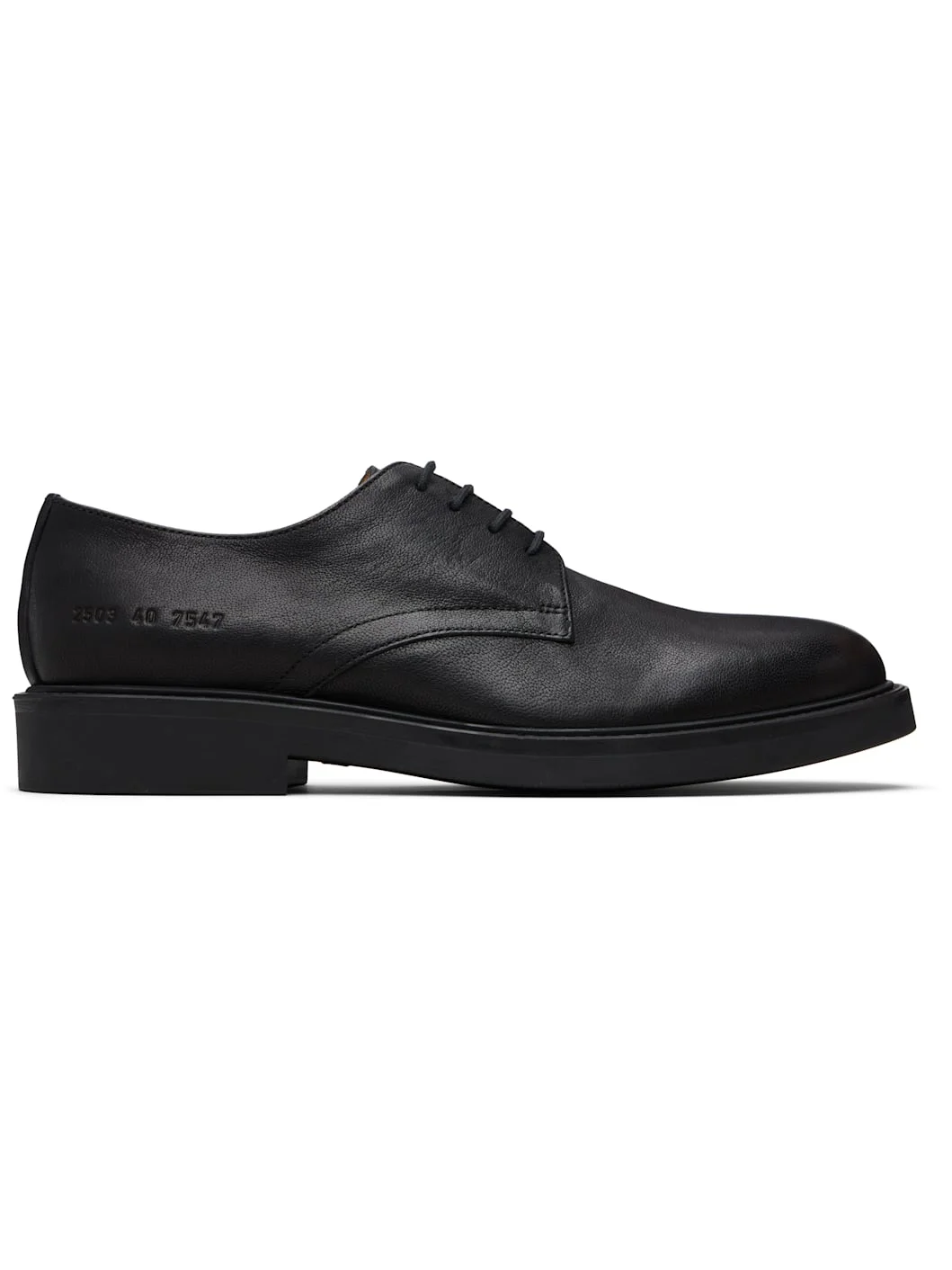 Grained sheepskin derbys. · Lace-up closure · Text embossed at outer side · Buffed leather and suede lining · Textured rubber sole Supplier color: Black Upper: sheepskin. Sole: rubber. Made in Italy 252133M225001