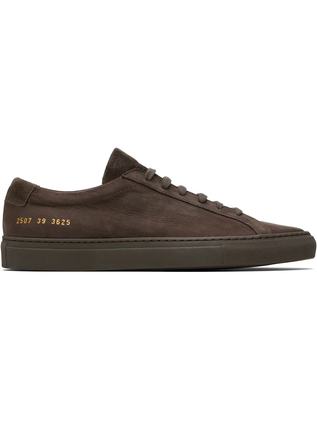 Low-top calfskin nubuck sneakers. · Lace-up closure · Padded tongue and collar · Text stamped at outer side · Nubuck lining · Treaded rubber sole Supplier color: Moka Upper: calfskin. Sole: rubber. Made in Italy 252133M237031