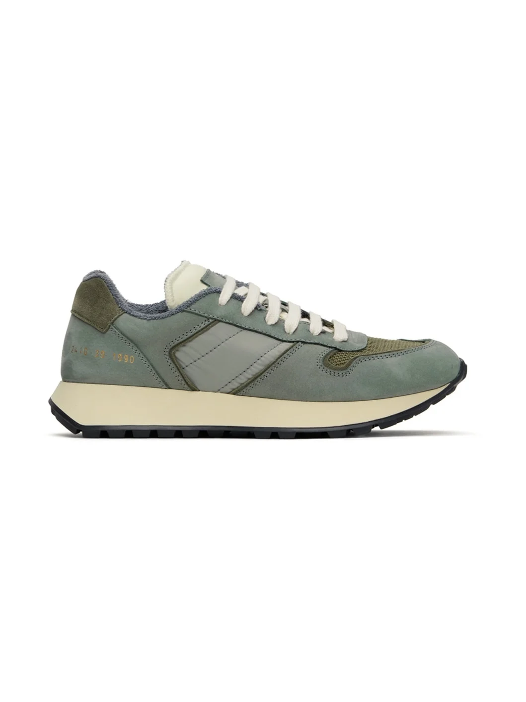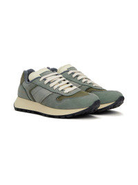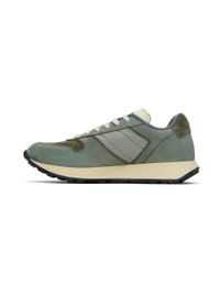 Low-top suede, twill, and knit sneakers in green. · Lace-up closure · Suede patch at padded tongue · Padded collar · Signature series stamp at outer side · Terrycloth lining · Foam rubber midsole · Treaded rubber sole Supplier color: Green