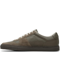 Low-top paneled grained sheepskin and calfskin suede sneakers. · Perforations at toe and outer side · Lace-up closure · Padded tongue and collar · Text stamped at outer side · Buffed leather lining · Treaded rubber sole Supplier color: Olive Upper: sheepskin, calfskin. Sole: rubber. Made in Italy 252133M237017