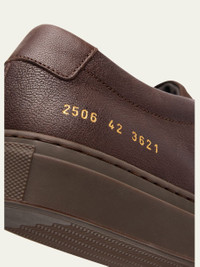 Common Projects lowtop sneakers in premium soft grained leather for a comfortable finish Unique foiled serial code on the side Flat heel Round toe Laceup vamp Leather lining Padded collar Rubber outsole Made in Italy