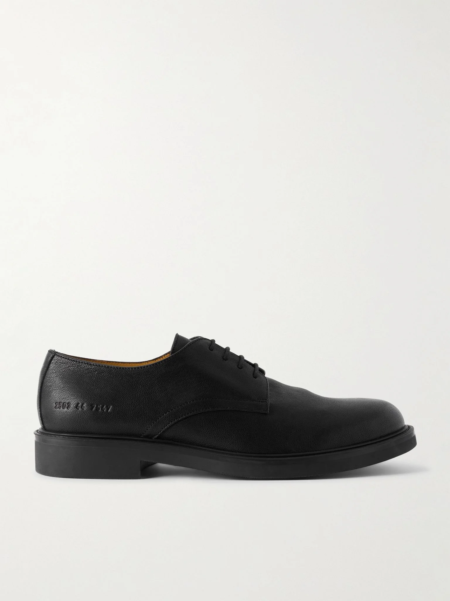Common Projects' 'Officer's' shoes rest on chunky rubber tread soles, making them edgier than traditional derby styles. They're made from leather stamped with a signature golden serial number on the heels. Size & Fit - Fits true to size. Take your normal size - Only available in full sizes, go up to the nearest whole size if you take a half size - European sizing Details & Care - Black leather (Sheep) - Lace-up