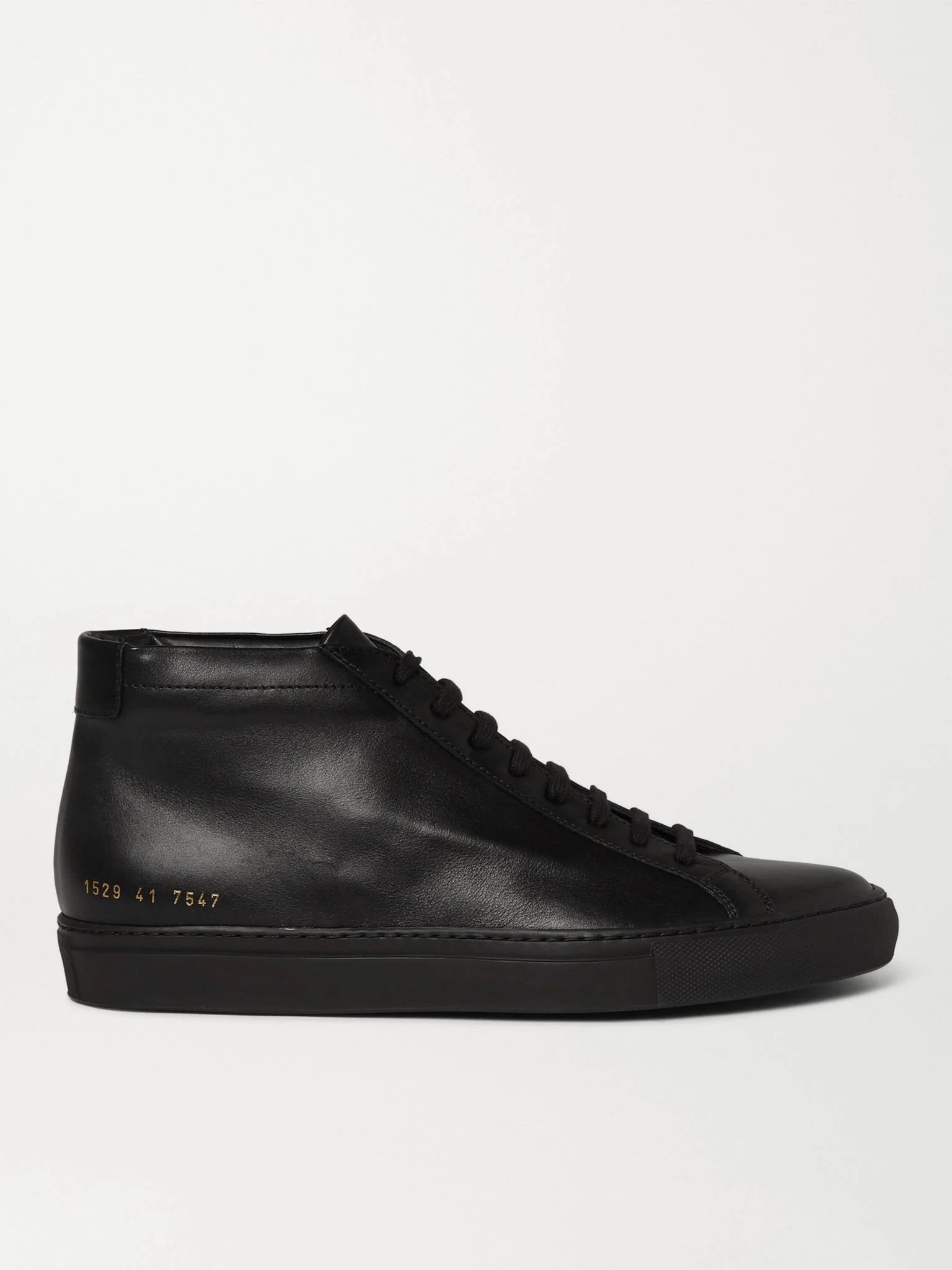 Common Projects has built its impressive reputation on superb construction and pared-back design, as these high-top 'Original Achilles' sneakers demonstrate. Crafted in Italy from high-shine black leather, they'll add a shot of sleek texture to your contemporary lineup. Shown here with [Polo Ralph Lauren T-shirt id546933], [Simon Miller jeans id650735], [Officine Generale cardigan id759087], [Mikia bracelet id824079]. Size & Fit - Fits true to size. Take your normal size - Only available in full sizes, go down to the nearest whole size if you take a half size - Narrow at the top of the foot - European sizing Details & Care - Black leather - Gold stamped serial numbers, leather linings, rubber soles - Lace-up - Come with dust bag and spare laces - Made in Italy