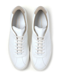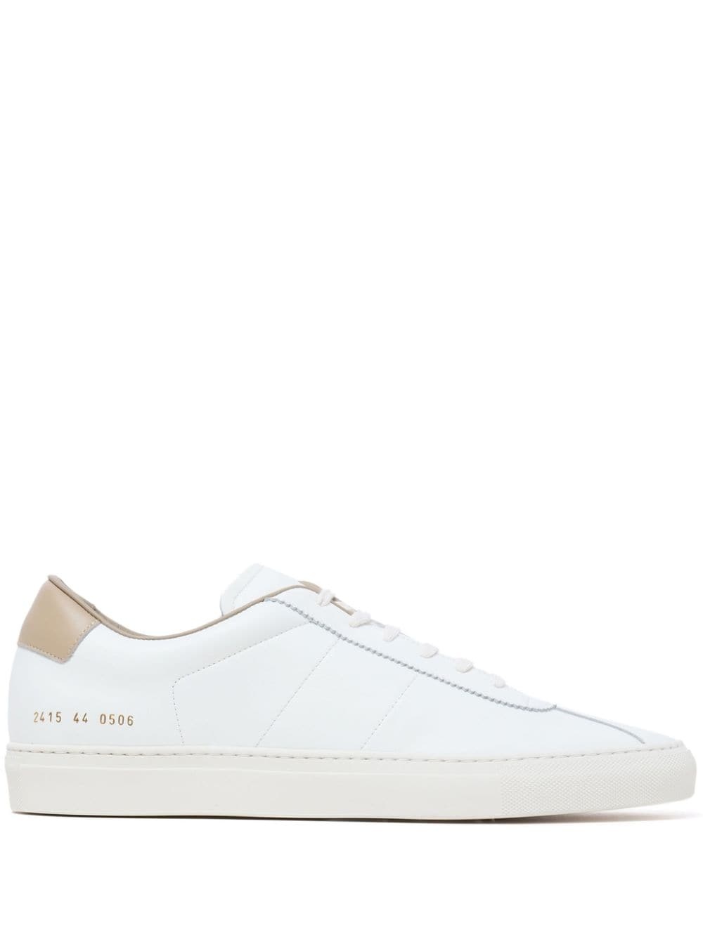 Tennis 70 leather sneakers Inspired by classic tennis footwear, Common Projects' Tennis 70 are seen here in a white and beige iteration that's expertly crafted from calf leather. Understated gold-tone branding is placed at the footbed and sides. Highlights - White/beige - Calf leather - Smooth grain - Signature numbers motif - Contrasting heel counter - Round toe - Front lace-up fastening - Branded insole - Rubber outsole Made in Italy Composition Lining: Fabric 100% Outer: Calf Leather 100% Sole: Rubber 100% SIZE & FIT Measurement Sole height 0.78 in(2 cm) HEEL 1.18 in(3 cm)