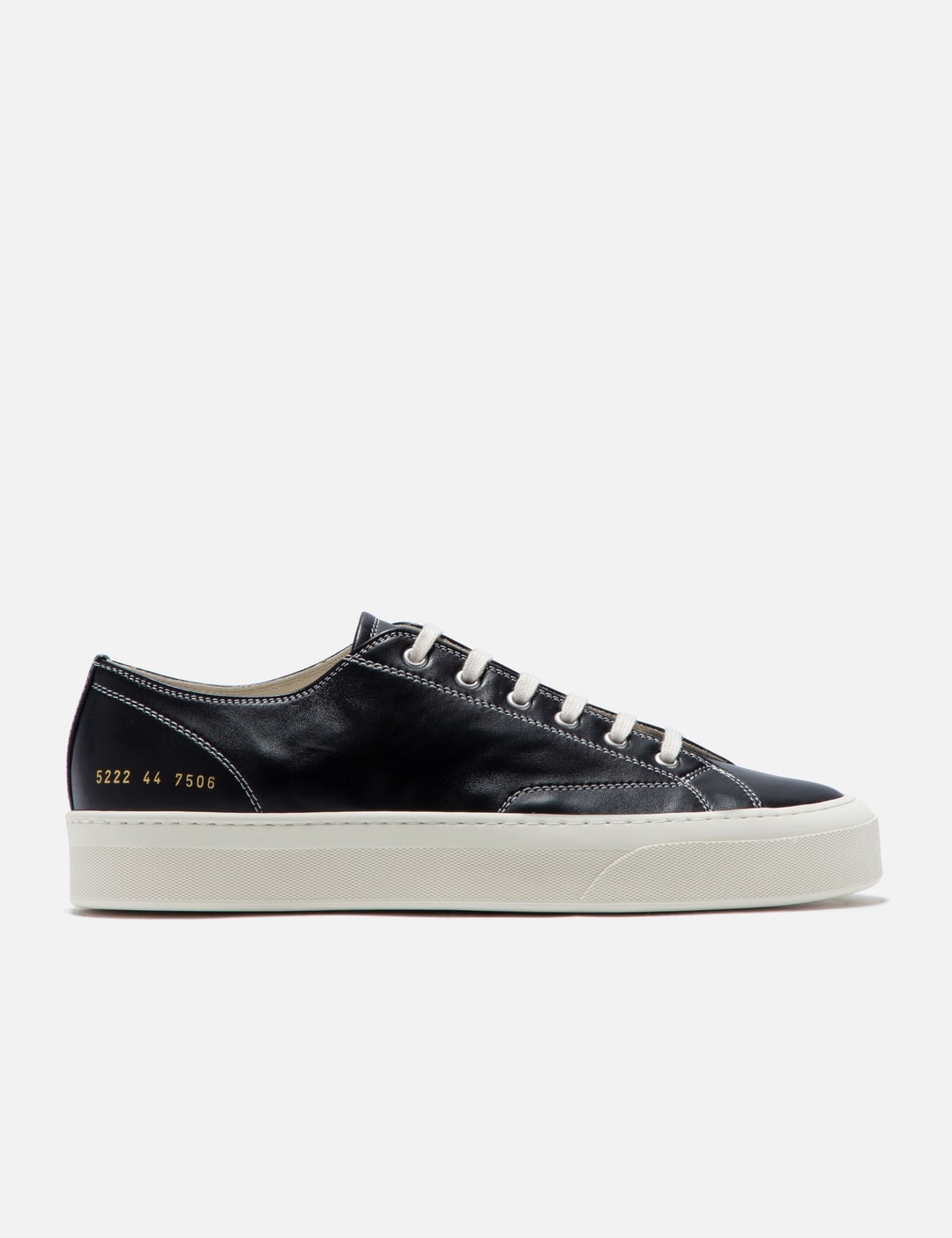 - Common Projects - Tournament Low Top Sneakers - Leather upper - Lace-up closure - Contrast stitching - Rubber outsole - Color: Black - Material: Leather, Rubber - See more Sneakers and Shoes