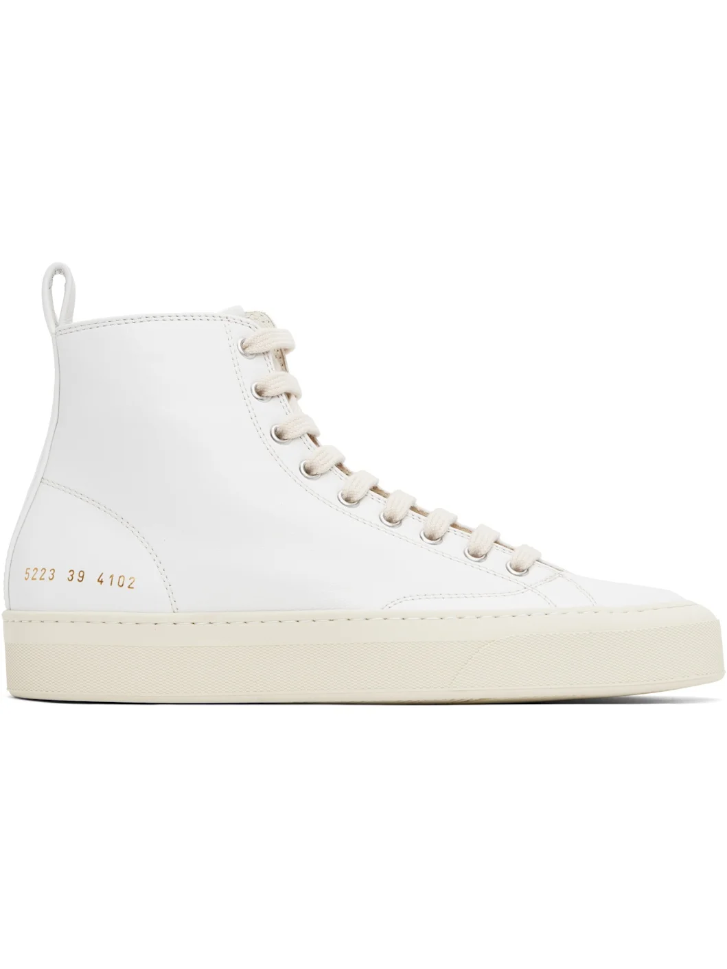 High-top buffed leather sneakers in off-white. · Lace-up closure · Pull-loop at heel collar · Signature series stamp at outer side · Suede and twill lining · Textured rubber midsole · Treaded rubber sole Supplier color: Off white Upper: leather. Sole: rubber. Made in Italy 251133M236004