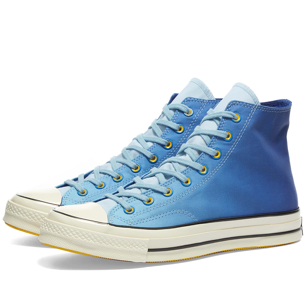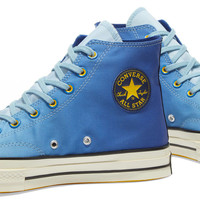 Head into the Heart of the City in style thanks to these cool blue canvas Chucks from Converse. Cut high at the ankle, they’re inspired by life in Los Angeles, accented with sunny hits of yellow, and completed with a cool gradient aesthetic. - Canvas Uppers - Rubber Toe Cap - High Foxing Tape - Rubber Outsole