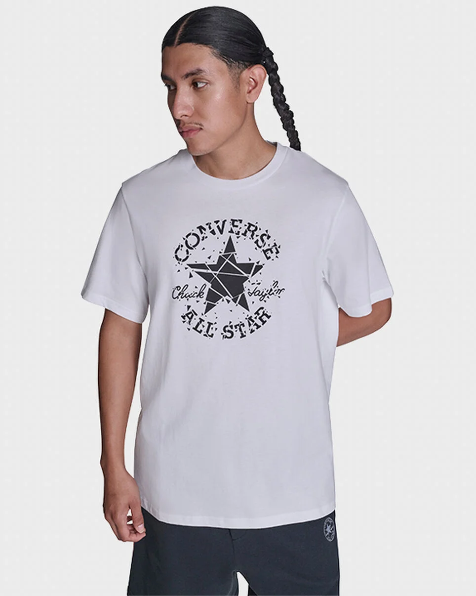 A classic cotton tee with a sharp, shattered edge. SHATTER EXPECTATIONS Made from 100% cotton jersey, this tee breaks the mold with a high-impact Chuck Taylor logo design. WHY YOU SHOULD BE DOWN - Cotton jersey fabric delivers everyday comfort - Standard fit gives you a relaxed look and feel - Classic crew-neck coverage - Crushed-up Chuck Taylor logo for standout style - 100% Cotton - SKU: CVM6T087-WHT