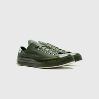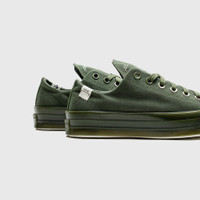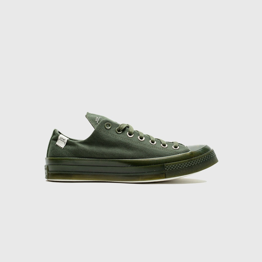 - A06688C - Rifle Green/Silver/Birch - Samuel Ross and his A-COLD-WALL imprint connect with Converse revisiting the classic Chuck 70 - Canvas upper - Popped matte eyelets - Printed co-branding on the tongue and toe - "A-COLD-WALL" embossed on the heel tape - Canvas A-C-W* branded tab on the lateral collar - Translucent license plate, toe bumper, toe cap & midsole - Rubber outsole
