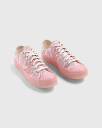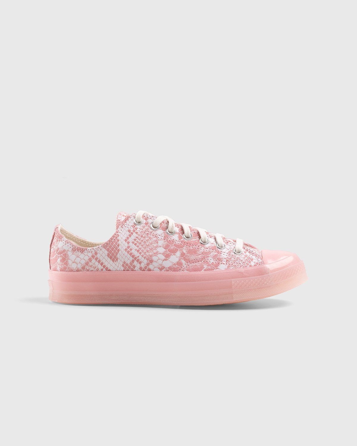 Golf Wang x Converse’s Chuck 70 Ox boasts Tyler, the Creator’s affinity for exotic prints and patterns by boasting premium leather with an all-over embossed snakeskin print. In addition to utilizing leather instead of canvas, Tyler and Golf Wang opt for a translucent outsole and foxing in place of the traditional white look to further elevate the iconic Converse silhouette. The Chucks are finished with a co-branded sockliner to signal the collaboration, which serves as Tyler, the Creator’s first-ever take on the low-top version of the sneaker. Emerging in tonal pink and blue colorways, the Golf Wang Chuck 70 Ox ultimately embodies Tyler’s boldness to explore what is next. Size & Fit Order your regular size. Product Details Leather upper. Embossed snakeskin print. Translucent foxing, toe cap, license plate, and outsole. Metal eyelets. Cotton laces. Co-branded sockliner.