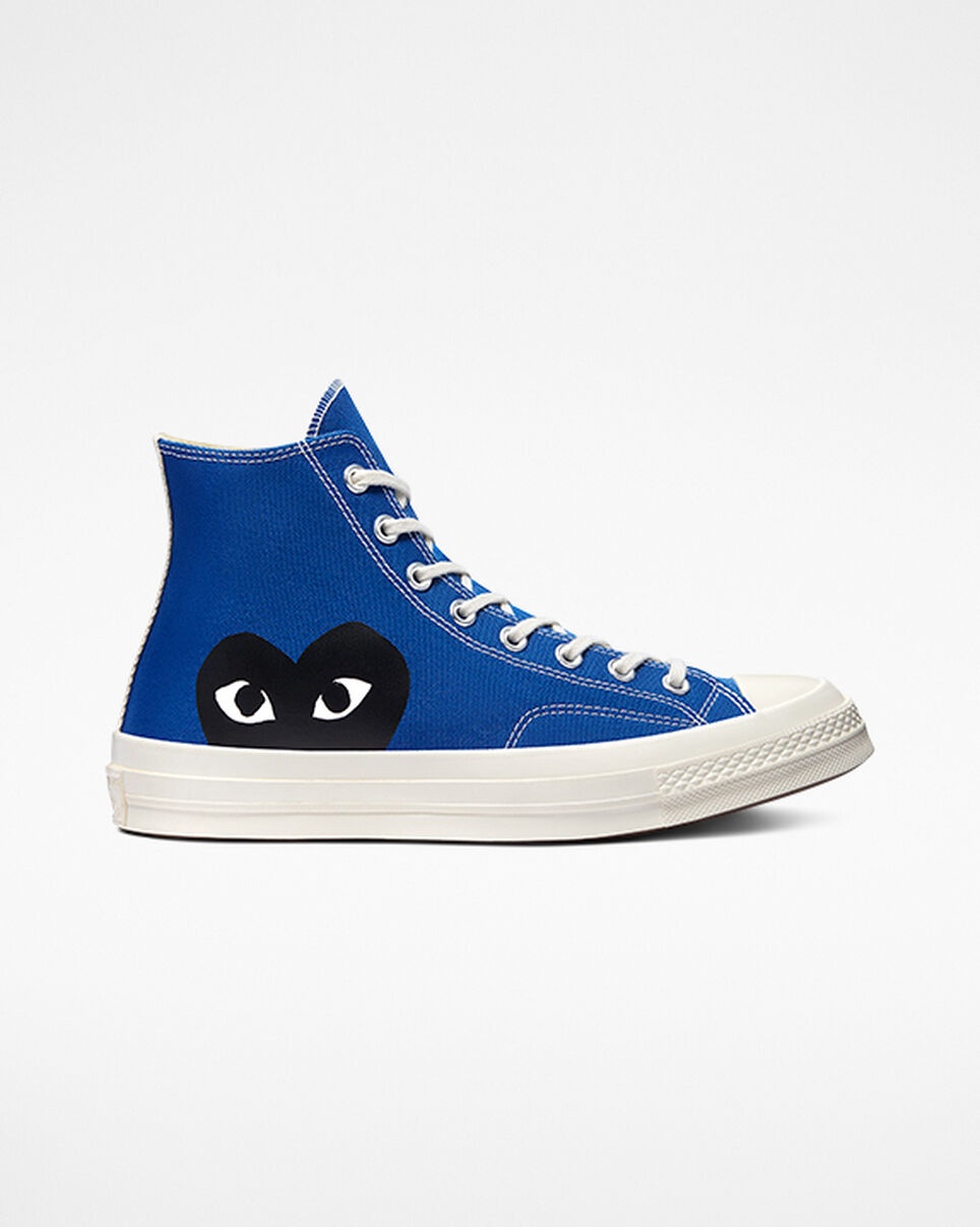 The fan-favorite peeking heart and eyes logo returns to the Chuck 70 in two new seasonal tones. CONVERSE x COMME DES GARCONS PLAY. The iconic partnership between Converse and Comme des Garcons has brought the brand’s conceptual vision to streets across the globe for over a decade—using the playful heart and eyes logo in distinct ways. This new release brings back the fan-favorite Comme des Garcons PLAY heart and eyes logo on a minimalist Chuck 70. Featured here in contrasting black on your choice of vivid blue or muted gray, the logo is instantly recognizable. It’s a bold twist on the premium design, but features the expertly-crafted Chuck 70 elements you know and love. WHY YOU SHOULD BE DOWN - Limited-edition high top sneaker in new seasonal colors. - Iconic Comme des Garcons PLAY heart-and-eyes logo. - Crafted in premium canvas for an elevated feel. - OrthoLite insole cushioning for all-day comfort. - Heritage details like a 1970s heel logo nod to its legacy. - SKU: 171846C