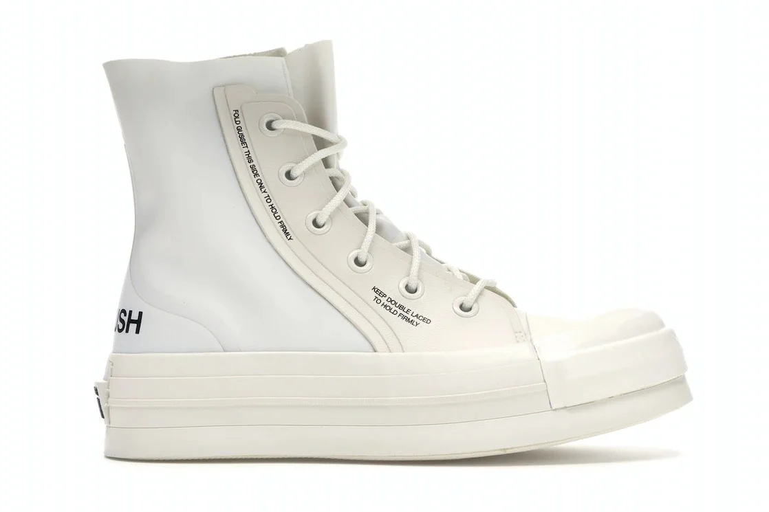 Ambush draws inspiration from 1950’s military attire for the Converse Chuck Taylor All-Star 70s Hi Ambush White, now available on StockX. Developed during the Korean War of the early 1950’s, Mickey Mouse boots (or Bunny Boots) became a vital part of the military’s extreme cold weather clothing system. In preparation for this winter, Ambush has fused the classic design elements of Bunny Boots with the classic silhouette of the Converse All-Star Hi. This Converse All-Star 70s Hi features a coconut milk rubberized upper with matte detailing and printed external instructions paying homage to the functional construction of the bunny boot. A heightened platform midsole, bold Ambush branding on the heel, and waxed tubed laces complete the design. These sneakers released in October of 2019 and retailed for $180. - Style 166516C - Colorway White/White - Retail Price 180 - Release Date 2019-10-19 - Included Accessories Orange extra laces - Featured false