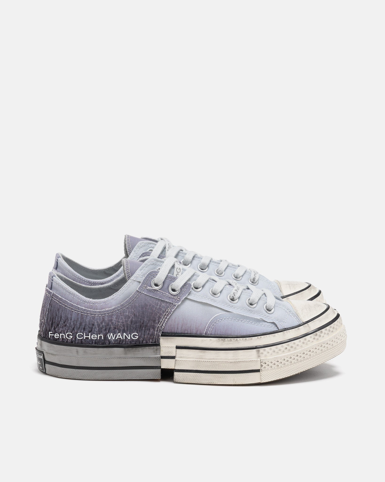 Feng Chen Wang reimagines the iconic Chuck 70 through the lens of traditional Jian Ware ceramics. This limited-edition 2-in-1 sneaker features a layered design that mimics a shoe within a shoe, rendered in canvas with graphic treatments that evoke handcrafted clay glazes. Burnished sidewalls and sculptural detailing add a weathered, artful dimension. The result is a bold fusion of heritage and innovation—part sneaker, part statement piece. DETAILS - A15742C - Limited-edition design by Feng Chen Wang - Canvas upper - Graphics inspired by Jian Ware - 2-in-1 construction - Burnished sidewall tape - Lightweight EVA midsole - Branding printed at lateral - Lace-up closure - Extra set of co-branded laces included