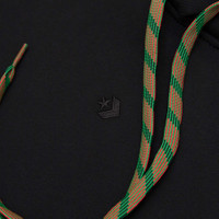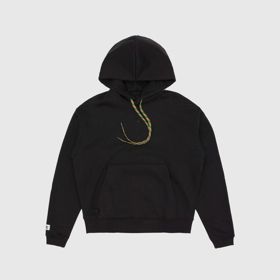 - 10024269-A01 - Black - 75% Cotton, 17% Recycled Polyester, 8% Organic Cotton - 465 GSM heavy weight fleece - Custom drawcord - Embroidered detailing - Kangaroo pocket - Back vent - Ribbed cuffs and hem
