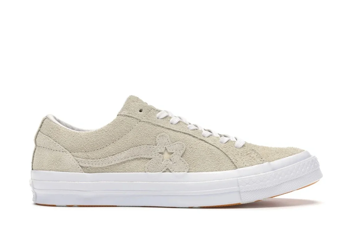 The Converse One Star Ox Tyler the Creator Golf Le Fleur Vanilla is an iteration of the classic Converse One Star, redesigned by Converse in collaboration with American hip-hop artist and record producer Tyler, the Creator under his fashion label Golf le Fleur. Dressed in Vanilla and White, each side of the Tyler the Creator Converse One Star Ox Golf le Fleur Vanilla features a Vanilla suede upper detailed with Golf le Fleur logos on the sides and similar-colored overlays around the lacing area and at the heel. This upper rests on a white midsole with diamond patterning at the round toe and a Converse Chuck Taylor All Star license plate at the heel. The shoe’s build is completed by an orange rubber outsole with white Golf le Fleur logo prints. Note that to enhance its stability, its outsole is patterned. What we love about the Converse One Star Ox Tyler the Creator Golf le Fleur Vanilla is how it pulls off its color scheme. This is because though many sneakers share the same color scheme as this shoe, released on November 2, 2017, for $100, only some pull it off as well as this one does. - Style 160324C - Colorway Vanilla/White - Retail Price 100 - Release Date 2017-11-02 - Featured false