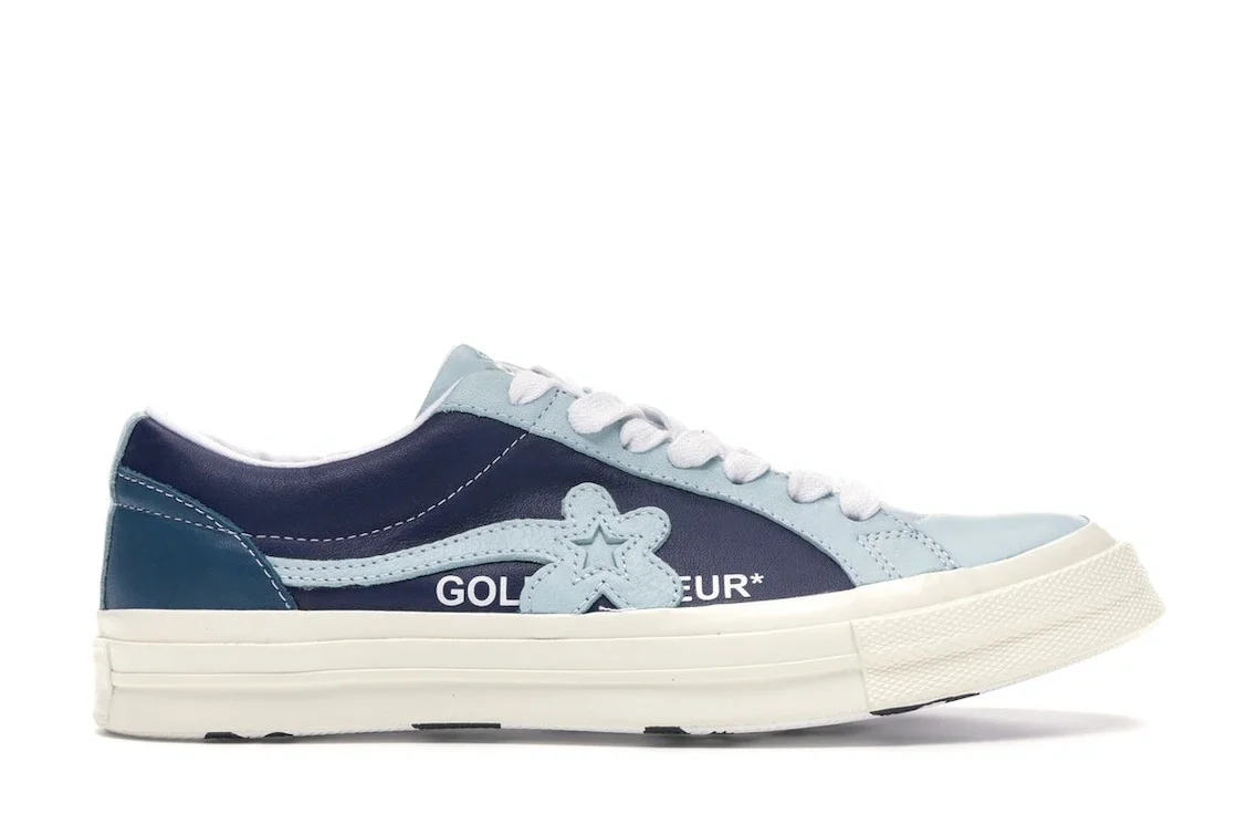 The Converse One Star OX Golf Le Fleur Industrial Pack Barely Blue was released in collaboration between Tyler the Creator and Converse. The Converse One Star OX Golf Le Fleur Industrial Pack Barely Blue is doused in leather and shows off three panels of Barley Blue, Patriot, and Egret to compose the tonal design. A white liner matches cotton laces and a bulky midsole down below while a horizontal flower and star logo is stitched to the midfoot to call out both brands. The Converse One Star OX Golf Le Fleur Industrial Pack Barely Blue was released on Feb 23, 2019 at a retail price of $110. - Style 164024C - Colorway BARELY BLUE/PATRIOT/EGRET - Retail Price 110 - Release Date 2019-02-23 - Featured false