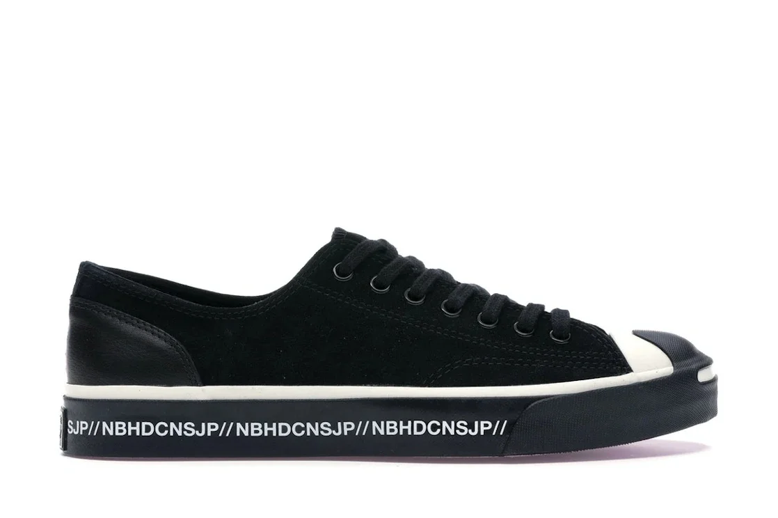 The Converse Jack Purcell Ox Neighborhood Motorcycle was released as a collaboration between Converse, Neighborhood, and Jack Purcell. The sneaker is a low-cut silhouette in a black and white color palette. The Ox Neighborhood Motorcycle Converse Jack Purcell has an upper that is made from durable canvas, ensuring longevity and comfort. The shoe also boasts a lacing system that allows for a secure and adjustable fit. In addition, the shoe has a cushioned midsole that offers responsive cushioning and impact protection, ensuring comfort and support. The sneaker is equipped with a rubber outsole, providing traction and stability. Moreover, the sneaker's midsole features "CONVERSE Jack Purcell" embellishment and an iteration of "NBHDCNSJP" lettering. What we like about this sneaker is its bold colorway, featuring white detailing on a generally black background, creating a vibrant look. The Converse Jack Purcell Ox Neighborhood Motorcycle was released on August 24, 2019, and sold at a retail price of $125. - Style 165604C - Colorway Black/White - Retail Price 125 - Release Date 2019-08-24 - Featured false