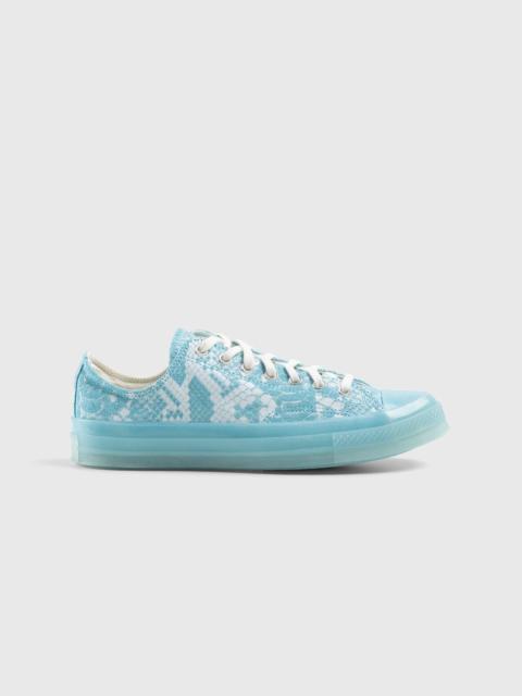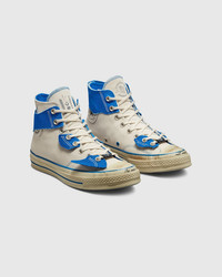 Inspired by the old, Ader Error’s new collaboration on the Chuck 70 Hi showcases a distinctive layered technique, ultimately celebrating the look of aged, well-worn sneakers. The shoe’s suede upper draws inspiration from the iconic aesthetic of old Chucks, with imperfect details such as detachable overlays and a burnished, distressed effect on the foxing incorporated to capture the spirit of vintage kicks. This distorted yet forward-looking take on the classic Converse silhouette adheres to Ader Error’s design ethos of “the new is not new,” as the brand continually looks to the past to design what’s next. Size & Fit This style runs a half size large. Product Details Suede upper. Floating, removable canvas overlays. Torn, tattered appearance. Blue pinstripes. Burnished, distressed effect at the foxing. Suede tongue. OrthoLite cushioning for all-day comfort. Vulcanized rubber sole. Rubber foxing. Rubber toe cap. Graphic prints and embroidered detail. Suede Ader Error ankle patch. Custom license plate, sockliner, lace clip, and graphic outsole.