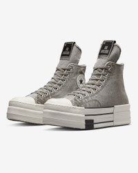 Fashion designer Rick Owens ups the ante on his transformative DRKSTR Chuck 70 with a double-stacked outsole and striking overdyed canvas—available in “concrete” and “blonde.” The subversive design both celebrates and distorts the lines of our most iconic silhouette—literally stretching the possibilities with an elongated tongue and raised platform while adding a distinctive speckled aesthetic to the signature cap, heel, and foxing tape. Benefits - Limited-edition high-top sneaker designed by Rick Owens with a canvas upper with overdyed color treatment, elongated tongue, and molded rubber double stacked platform - Signature toe cap, heel and foxing tape feature a distinctive speckled aesthetic - Molded rubber DRKSHDW toecap, rubber heel, and toe components - Custom molded DRKSHDW license plate on left heel, Converse branded license plate on right heel - Spare lace and custom branded wrap around woven label - Shown: Concrete - Style: A06755C-020