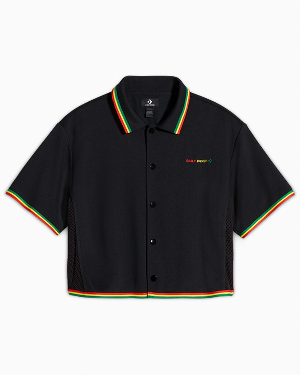 Daily Paper blends cultural heritage with contemporary style with a limited-edition cropped shirt. CONVERSE X DAILY PAPER Daily Paper elevates their detail-driven blend of contemporary street style and African heritage with a limited-edition cropped shirt. The design features a double-knit cotton and polyester construction, unique cropped fit, a custom embroidered Daily Paper Star Chevron and Pan-African colors. WHY YOU SHOULD BE DOWN - Limited-edition cropped shirt in a cropped body fit - Double knit cotton polyester mix - Features a center front snap closure and ribbed side panels - Multi-colored Daily Paper Star Chevron embroidery - 80% COTTON, 20% POLYESTER - SKU: 10027831-A01