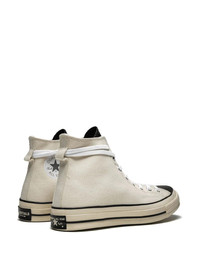 x Fear of God Chuck 70 Hi "White" sneakers The Fear of God x Converse Chuck 70 Hi is a premium take on the iconic sneaker by FOG founder Jerry Lorenzo. The FOG Essentials Chuck Taylor features the silhouette in a unique color block with Natural canvas covering most of the upper and black leather for the tongue. The black hue continues down onto the shoe’s signature rubber toe cap to create a distinct two-tone look. Lorenzo also adds another modification to the model, a loop on the heel to thread the shoe laces through if you opt to wrap them around the ankle. The Fear of God x Converse Chuck 70 Hi released in December 2018. Featuring an almond toe, a two tone design, a branded insole, a front lace-up fastening with wraparound ties, a logo patch at the ankle and a logo patch at the heel. Imported Composition Sole: Rubber 100% Outer: Canvas 100%
