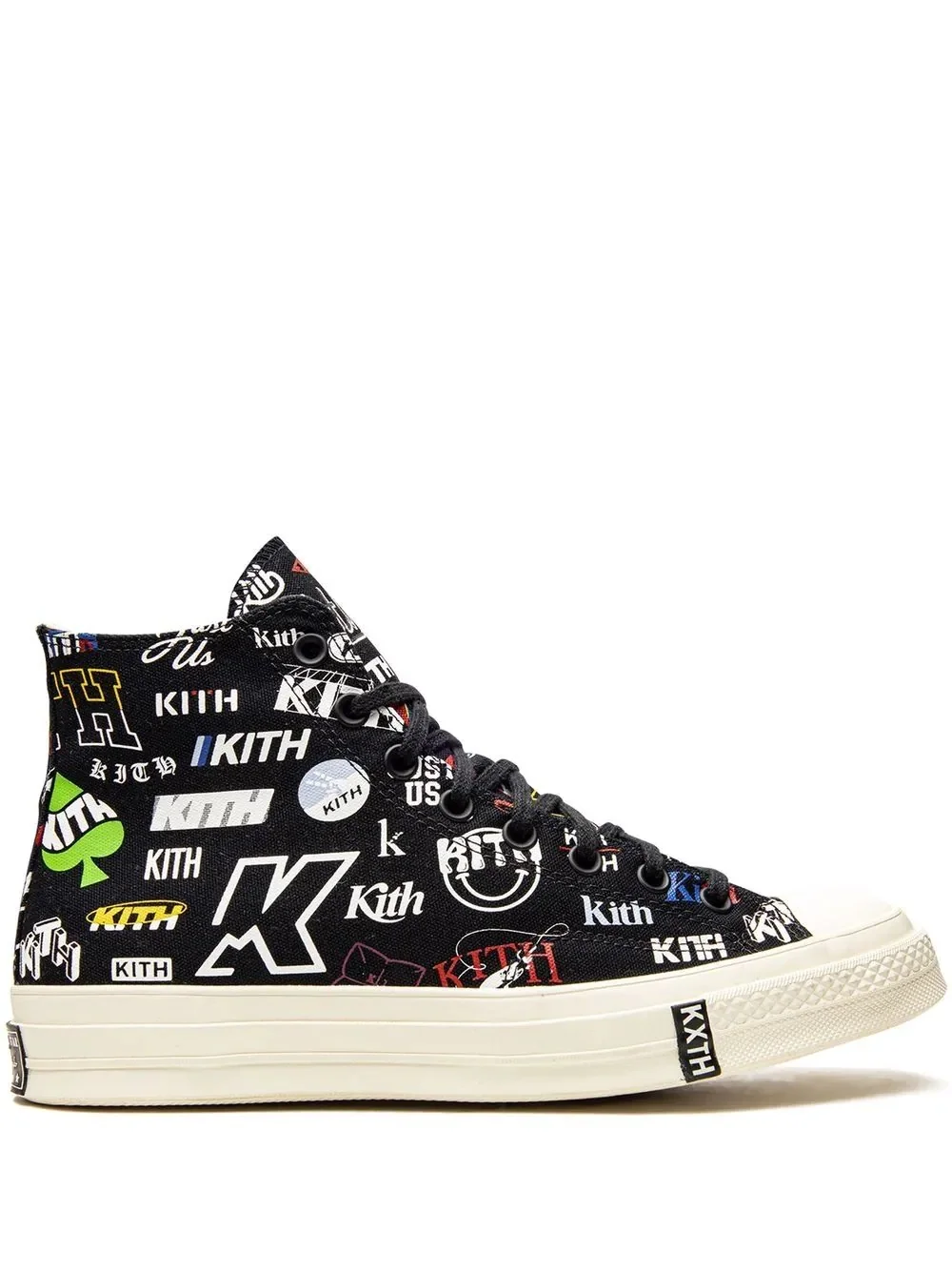 x Kith Chuck 70 Hi "10th Anniversary - Black" sneakers Created as a celebration of ten years of collaborations, these Converse x Kith sneakers stand out thanks to all-over logo print detailing. A re-crafted design, the Chuck 70 Hi nods to the original Chuck Taylor All Stars, adding a cushioned footbed to the iconic silhouette. Imported Composition Outer: Canvas 100% Lining: Canvas 100% Sole: Rubber 100%