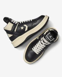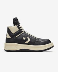 The ongoing collaboration with DRKSHDW transforms another court icon: the Converse Weapon. With a rebellious mindset to challenge the ubiquitous and break convention, Rick Owens exaggerates the proportions and distorts the lines of the legendary basketball sneaker. The result is a distinct design that sits at the intersection of hoops style and subversive fashion, bringing the edge of DRKSHDW boots to an iconic ‘80s basketball high top. Benefits - Limited-edition high-top sneaker designed by Rick Owens - Leather upper with an elevated platform midsole - Exaggerated proportions including an elongated tongue and blown-out midsole - CX Foam midsole with supportive midfoot side pods; foam molded toe and rubber molded heel - Custom Rick Owens wrap-around woven label Product Details - Shown: Black/Cloud Cream/Egret - Style: A03945C-001
