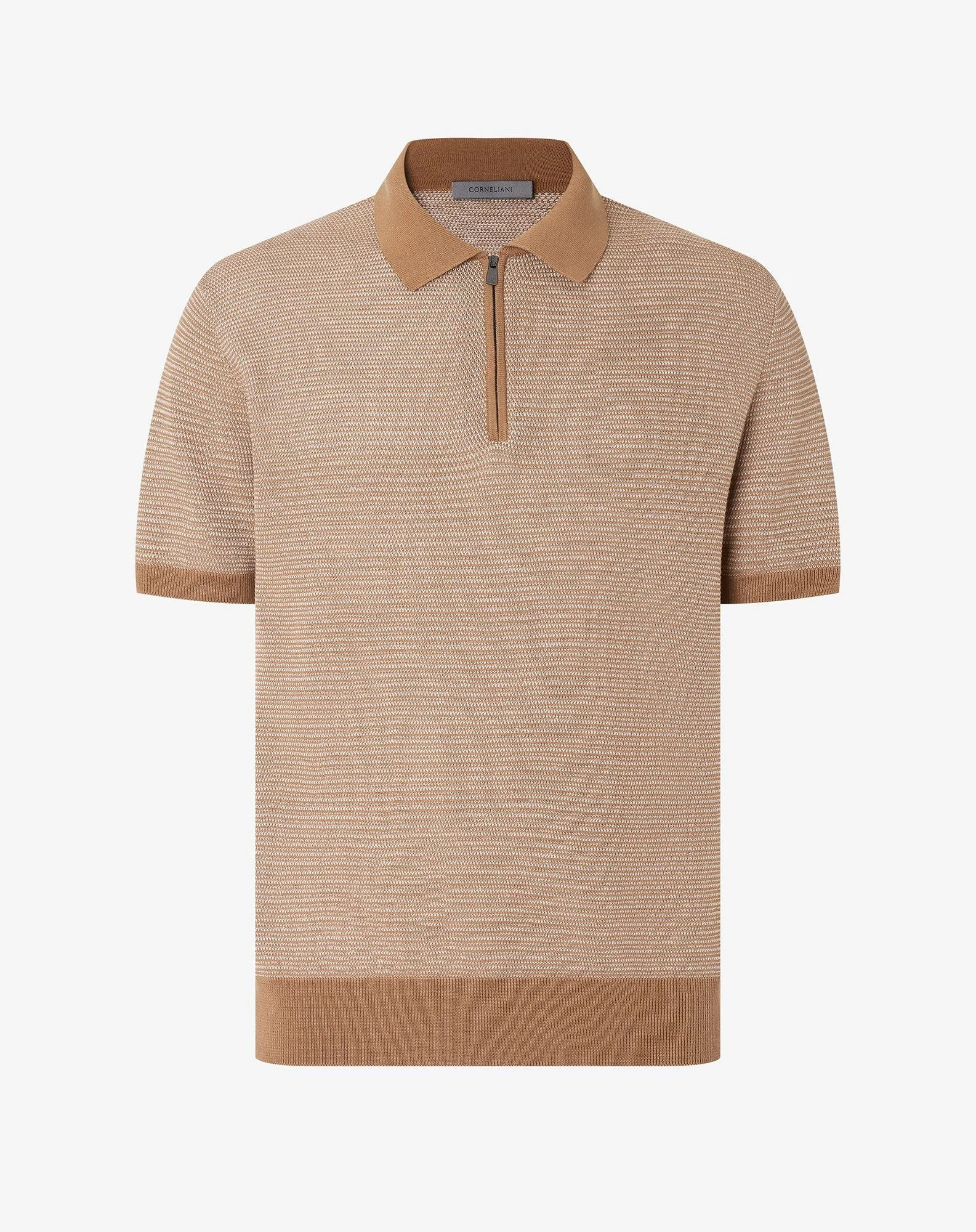 This garment has a regular fit. Dry clean with perchloroethylene, do not bleach, do not tumble dry, maximum iron temperature 110° DETAILS AND MATERIALS - Made in Italy from pure combed cotton jacquard, this short-sleeved brown polo shirt with zip is characterised by a superior quality, soft and compact yarn. The jacquard pattern creates a design that gives movement to the garment, while the fine 14 gauge knit ensures comfort and lightness. FIT & WASHING - 100% cotton - zipped short-sleeved polo shirt made from two-tone combed jacquard cotton - 14 gauge - Made in Italy
