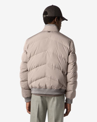 The beige bomber jacket in techno poplin combines lightness and warmth - thanks to the real goose down padding - without sacrificing style: the quilted back and sleeves enhance the garment with a technical and refined detail. The front closure with dual cursor zip and the dual 4-hole button neckline ensure practicality and style. Two double-welt pockets and a zipped chest pocket offer functionality, while ribbed knit trims on the collar, bottom and cuffs complete the design. DETAILS AND MATERIALS - 100% polyester - real goose down padded bomber jacket - quilted sleeves and back - drop 7 - front closure with dual cursor zip - two 4-hole buttons at the neckline - two double-welted pockets - breast pocket with zip - ribbed knit trim on collar, bottom and cuffs - nylon lining - length 67 cm FIT & WASHING - Dry clean with perchloroethylene, do not bleach, do not tumble dry, maximum iron temperature 110°