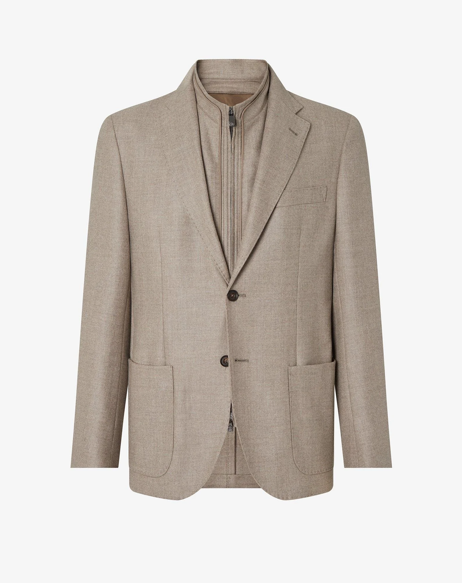 This beige wool and cashmere jacket combines elegance and functionality with natural sophistication. Made from a fine blend of cashmere and virgin wool, it features a classic two-button silhouette enhanced with a detachable zipped vest and suede piping details that amplify its bold personality. Semi-lined for greater comfort and lightness, it features notch lapels and appliqued pockets, while the double vents at the back ensure freedom of movement. Made in Italy, this garment is the ideal choice for those who seek uncompromising style. DETAILS AND MATERIALS - 93% virgin wool, 7% cashmere - 2-button jacket with detachable zipped vest with suede piping - semi-lined - drop 7 - regular fit - notch lapels - welt outbreast pocket - appliqued side pockets - double rear vent - length 74 cm - Made in Italy FIT & WASHING - Dry clean with perchloroethylene, do not bleach, do not tumble dry, maximum iron temperature 110°