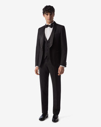 With its Corneliani Code formal menswear collection, Corneliani chooses the best in sartorial elegance to celebrate your special days and make them unforgettable. The pure wool tuxedo with waistcoat has a slim fit and side vents at the back for ease of movement. The lined, single-breasted and single-button jacket features satin details and gold-tone crystals. DETAILS AND MATERIALS - 100% virgin wool - tuxedo with lined single-breasted single-button jacket - slim fit - drop 8 - shawl lapels with tonal satin and appliqued gold-tone crystals on the edge - breast pocket - double-welted pockets with tonal satin - side vents on the back - formal wear lining - satin-covered buttons - back length 72 cm - 4-button waistcoat with appliqued gold-tone crystals on the edge - flat front trousers - slant front pockets - double-welt and button back pockets - belt loops - flap with curtained waistband - bottom 18 cm FIT & WASHING - The model is wearing a size 50 (IT). Model measurements: height 187cm, chest 98cm, waist 82cm, hips 98cm. Dry clean with perchloroethylene, do not bleach, iron at 110° maximum, do not use dryer