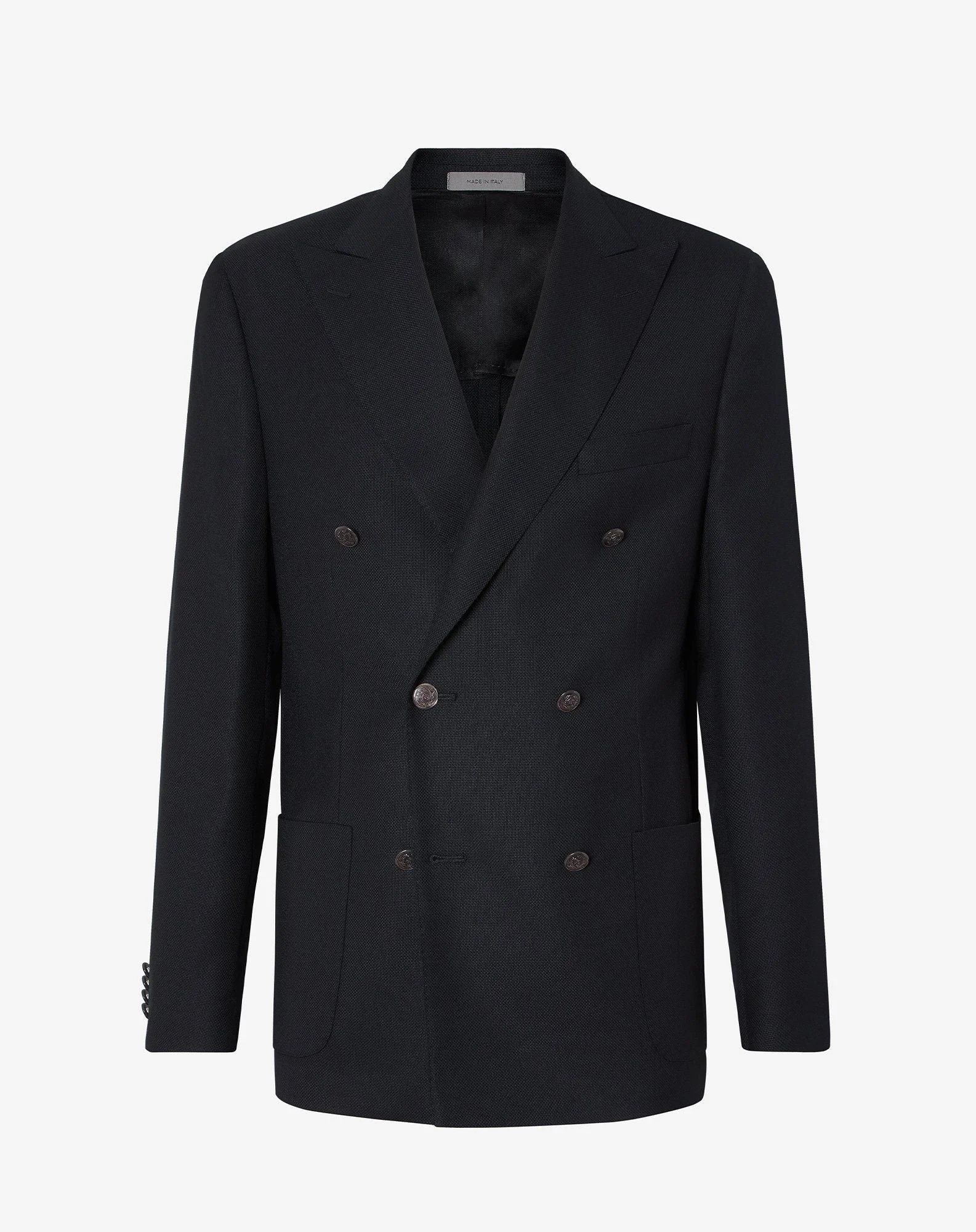 The unlined, double-breasted six-button hopsack Men's jacket has a slim fit, patch pockets and side vents at the back for greater ease of movement. Sartorial details such as the AMF stitching at the edge and the real horn buttons enhance the elegance of the garment without altering its casual style. Hopsack wool is characterised by a wider, more open weave, which makes this fabric extremely light, breathable and perfect for unlined jackets in the spring or summer season. DETAILS & MATERIALS - 100% virgin wool - double-breasted six-button S110's hopsack wool jacket - unlined - drop 7 - slim fit - pointy lapels - AMF stitching at the edge - breast pocket - appliqued pockets - side vents on the back - lapel width 11 cm - slanted iridescent lining - horn buttons - back length 74 cm - Made in Italy FIT & WASHING - The model is wearing a size 50 (IT). Model measurements: height 187cm, chest 98cm, waist 82cm, hips 98cm. Dry clean with perchloroethylene, do not bleach, iron at 110° maximum, do not use dryer