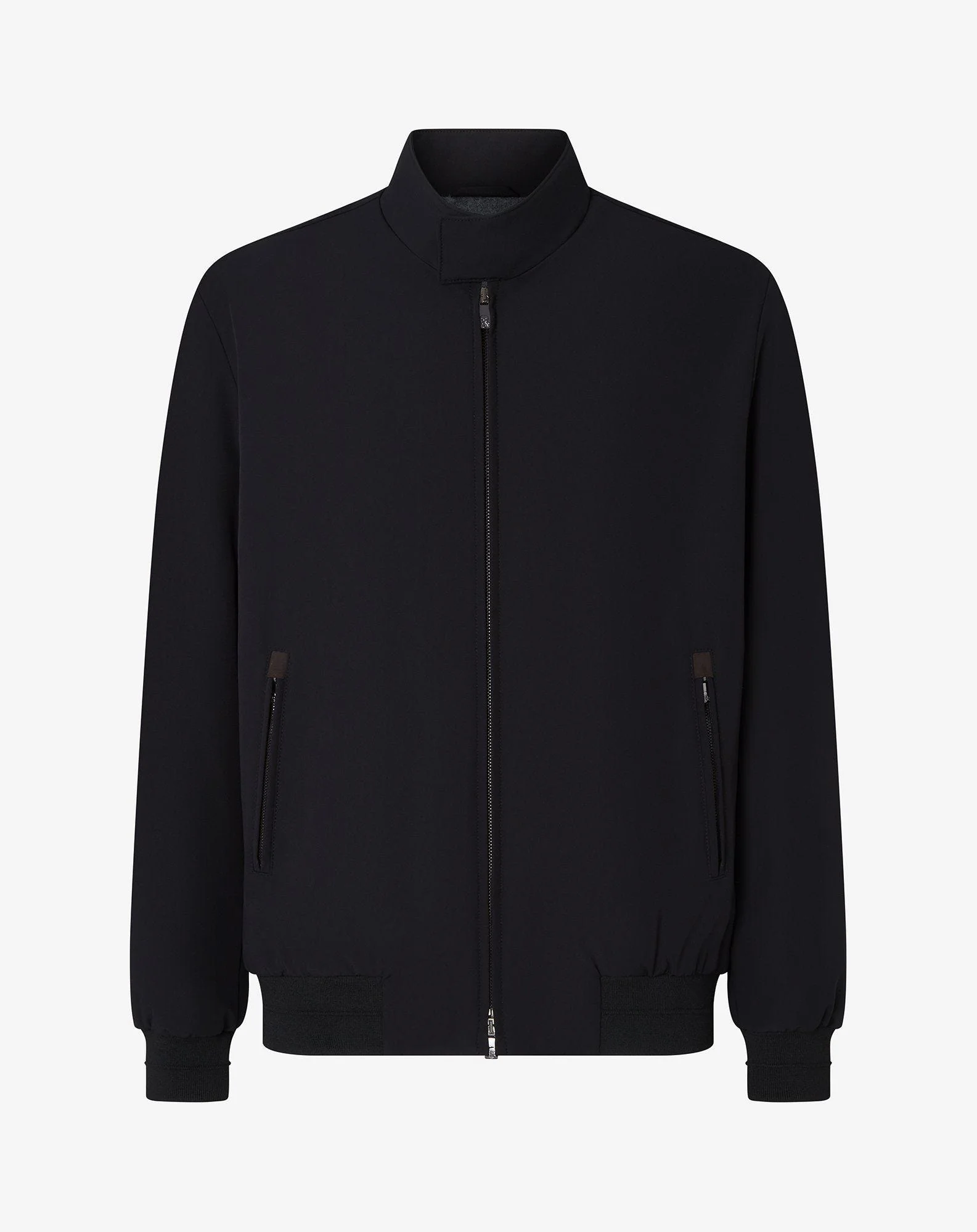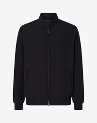 Black stretch technical fabric bomber jacket, the perfect balance between style and performance. Crafted in a blend of technical fibres, it is wadding-padded for a lightweight warm feel. The dual cursor zip closure is enhanced by the collar with two concealed snap buttons, while the zipped double welt pockets blend design with functionality. The inside of the collar, hem and cuffs are trimmed with ribbed knit and eco-suede details that add personality DETAILS AND MATERIALS - 90% polyamide, 10% elastane - wadding padded bomber jacket - drop 7 - dual cursor zip closure and two concealed snap button closure on neckline - two double-welted pockets with zip - ribbed knit trim on collar, bottom and cuffs - faux suede details - knit lining on body - nylon lining on sleeves - length 69 cm FIT & WASHING - Dry clean with perchloroethylene, do not bleach, do not tumble dry, maximum iron temperature 110°