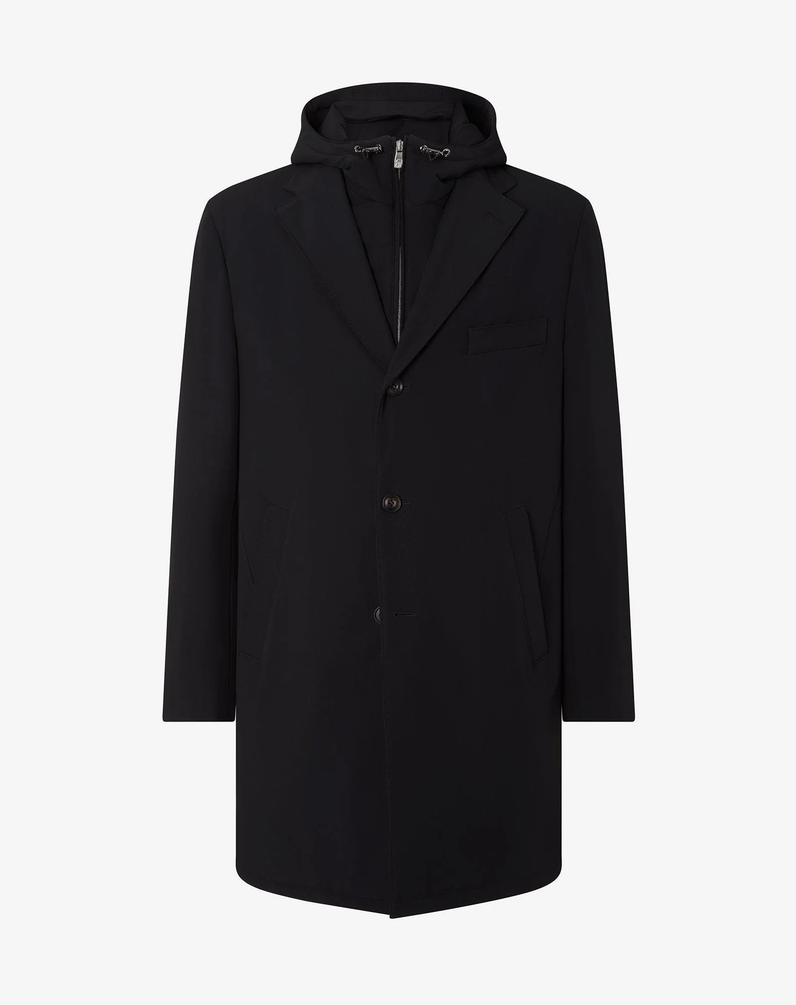 The collection's most iconic garment, this black single-breasted coat combines elegance with functionality. Made from a stretch technical fabric, this garment features a detachable hooded inner vest for versatile extra protection on the coldest days. The modern fabric gives a lighter feel to the clean lines and notch lapels, creating a balance between sartorial classicism and contemporary spirit. Lined, with slanted side pockets and regular fit, it is designed for the man who seeks both style and performance in one single garment. Made in Italy. DETAILS AND MATERIALS - 90% polyamide, 10% elastane - single breasted coat with detachable hooded inner vest - lined - drop 6 - regular fit - notch lapels - slanted side pockets - length 90 cm - Made in Italy FIT & WASHING - Dry clean with perchloroethylene, do not bleach, do not tumble dry, maximum iron temperature 110°