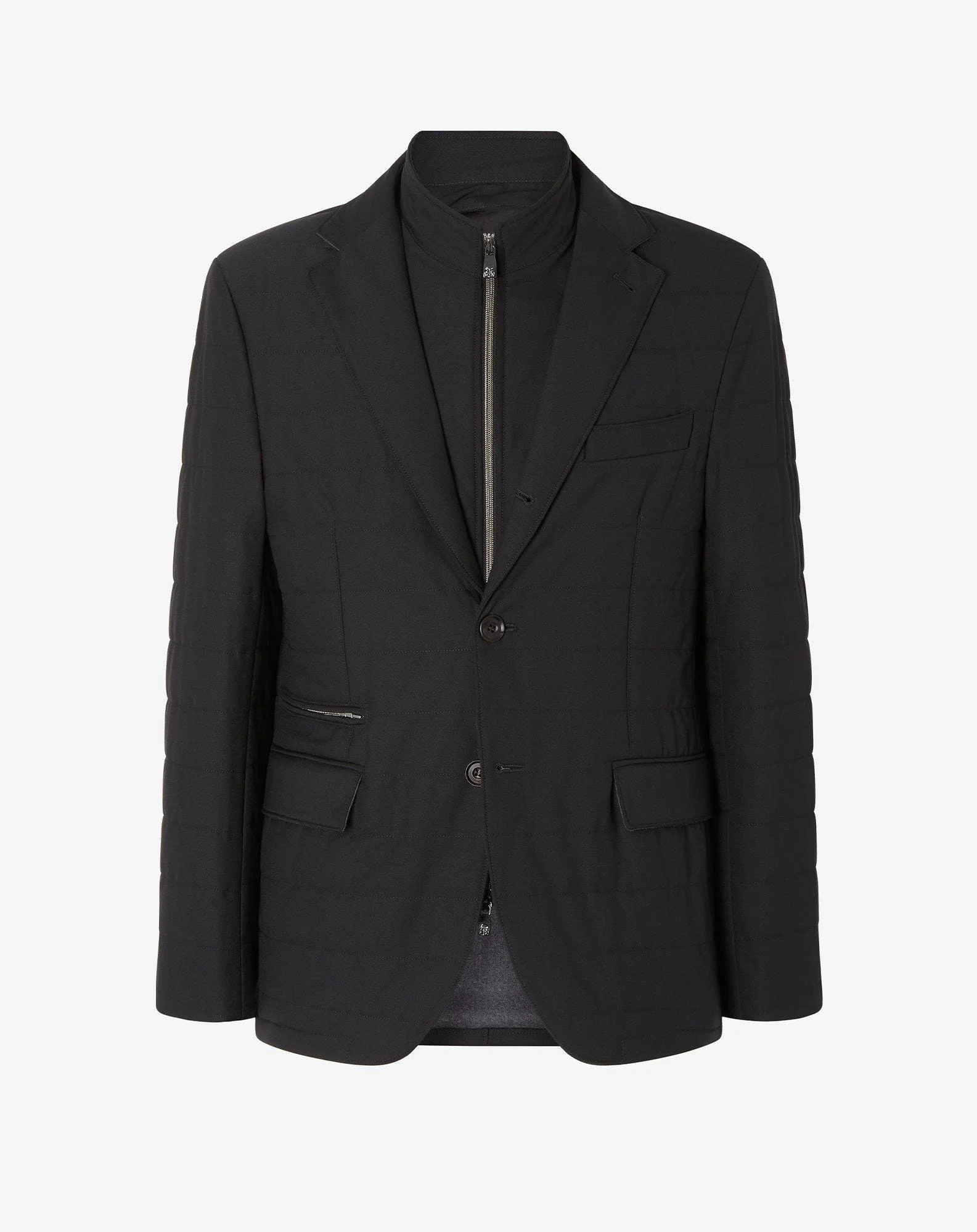 This black stretch technical wool jacket is the perfect synthesis between sartorial innovation and functional innovation. Crafted from a sophisticated mix of virgin wool and man-made fibres, it provides comfort, durability and ease of movement. Its silhouette is defined by stylish quilting and three-roll-two structure, while the notch lapels hints at a classic charm with a modern twist. The true value added comes from the detachable nylon vest, designed to protect the wearer from any weather condition. Details like the breast pocket, side flap pockets and zipped ticket pockets enhance the garment with a touch of sophisticated functionality. With a double rear vent and a light wadding padding, this jacket is designed for the contemporary man and features the best of tailoring Made in Italy. DETAILS AND MATERIALS - 51% virgin wool, 43% polyamide, 6% elastane - quilted three-roll-two jacket - lined - drop 6 - regular fit - notch lapels - detachable nylon vest - breast pocket - patch side pockets - zipped ticket pocket - double rear vent - lightweight wadding padding - length 74 cm - Made in Italy FIT & WASHING - Dry clean with perchloroethylene, do not bleach, do not tumble dry, maximum iron temperature 110°