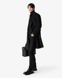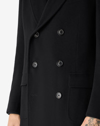 Timeless elegance takes shape in this black double-breasted coat made from pure wool beaver. Its natural shoulder design and regular fit offer balanced comfort, while pointy lapels, flap pockets and rear martingale achieve a sophisticated effect. Each detail, from AMF edge stitching to real horn buttons, shows Italian know-how. Essential, contemporary. Fully Made in Italy. DETAILS AND MATERIALS - 100% virgin wool - 6-button double-breasted superfine pure wool beaver coat - lined - regular fit - drop 7 - pointy lapels - 7mm AMF stitching at the edge - appliqued patch side pockets - martingale - central back vent - smooth satin lining - horn buttons - width 105 cm - Made in Italy FIT & WASHING - This garment has a regular fit. The model is wearing a size 50 (IT). Model’s measurements: height 187cm, chest 98cm, waist 82cm, hips 98cm. Dry clean with perchloroethylene, do not bleach, do not tumble dry, maximum iron temperature 110°