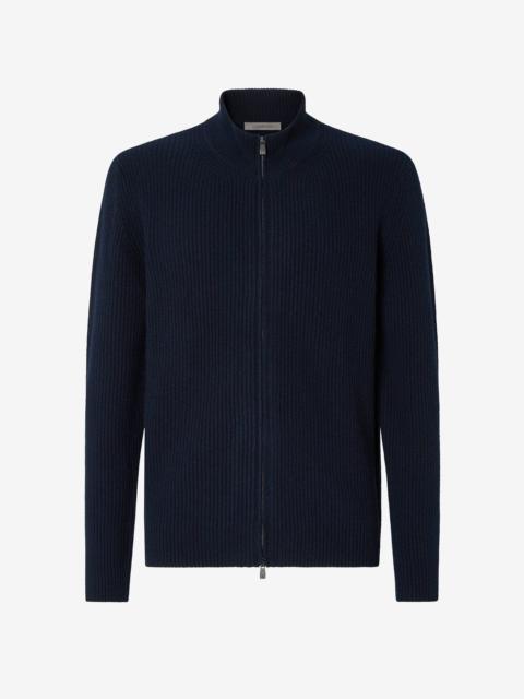 A garment that combines lightness and comfort, this blue full-zip, long-sleeved jumper is made from a fine mix of virgin wool, cashmere and natural fibres. The yarn was treated in a special way to ensure an incredibly soft feel, unparalleled lightness and natural elasticity for a perfect fit and long lasting comfort. Fully made in Italy, this jumper provides the perfect balance between functionality and sophisticated style, designed for the modern man who seeks high quality versatile garments. DETAILS AND MATERIALS - 43% virgin wool, 24% cashmere, 28% viscose, 5% polyamide - full zip long-sleeved wool, viscose and cashmere jumper - 7 gauge - Made in Italy FIT & WASHING - Dry clean with perchloroethylene, do not bleach, do not tumble dry, maximum iron temperature 110°