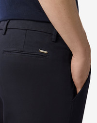 Garment-dyed blue chinos crafted from high-quality stretch cotton for a modern and comfortable wear. Unlined and flat front, these trousers feature regular fit, drop 7 size and a clean silhouette that will suit any occasion. Zip closure, belt loops and welt back pockets complete this versatile, minimalist garment. The 18 cm leg bottom defines their contemporary look and well crafted details. DETAILS AND MATERIALS - 97% cotton, 3% elastane - garment dyed flat front chino trousers - unlined - drop 7 - regular fit - zip closure - belt loops - welt back pockets - bottom width 18 cm FIT & WASHING - This garment has a regular fit. Dry clean with perchloroethylene, do not bleach, do not tumble dry, maximum iron temperature 110°