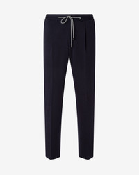 Made from interlock wool jersey, these blue joggers represent a synthesis of comfort and contemporary style. The unlined construction with front pleats and regular fit enhances freedom of movement, while the elastic belt with drawstring and zip closure ensure practicality and support . Slanted side pockets on the front and wide welt back pockets complete a sophisticated design, designed to elegantly accompany moments of relaxation or leisure. DETAILS AND MATERIALS - 92% virgin wool, 8% polyamide - single-dart wool interlock jersey joggers - unlined - drop 6 - regular fit - regular waist - zip closure - elastic waistband with drawstring - slanted hemmed side pockets in front - wide welt back pockets - bottom width 18.5 cm FIT & WASHING - This garment has a regular fit. The model is wearing a size 50 (IT). Model’s measurements: height 187cm, chest 98cm, waist 82cm, hips 98cm. Dry clean with perchloroethylene, do not bleach, do not tumble dry, maximum iron temperature 110°