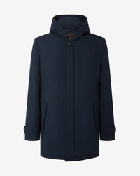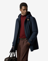 Contemporary versatility and impeccable protection come together in this blue wadding padded caban made from durable technical fabric. The garment features a front closure with dual cursor zip and 4-hole buttons — for an essential and refined look. The design is enriched by a detachable vest with drawstring adjustable hood with a practical dual cursor metal zip closure, which adds functionality and comfort on the coldest days. Inside, the quilted nylon lining houses three horizontal zip pockets, perfect for keeping your belongings safe. This garment represents the ideal balance between metropolitan style and technical protection, entirely made following the tailoring traditions of garments Made in Italy. DETAILS AND MATERIALS - 100% polyester - wadding padded caban - detachable inner vest with metal dual cursor zip and hood with drawstring - drop 7 - metal dual cursor zip closure and concealed 4-hole buttons, except the first one - two appliqued bellow pockets with concealed snap buttons - frog fasteners with 4-hole buttons at the cuff - leather details - quilted nylon lining - three double-welted horizontal pockets with zip inside - length 83 cm FIT & WASHING - Dry clean with perchloroethylene, do not bleach, do not tumble dry, maximum iron temperature 110°
