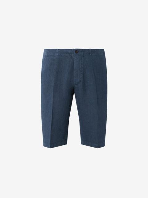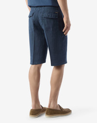 The stars of the summer's wardrobe, these blue pure linen Bermuda shorts are ideal for free time and weekend breaks. The drawstring at the waist guarantees maximum comfort and ease of movement. DETAILS & MATERIALS - 100% linen - garment-dyed pure linen Bermuda shorts - flat front - regular fit - drawstring at the waist - slant side pockets - two flapped back pockets with concealed button - doubled fabric inner belt FIT & WASHING - This garment has a classic fit. The model is wearing a size 50 (IT). Model measurements: height 187cm, chest 98cm, waist 82cm, hips 98cm. Dry clean with perchloroethylene, do not bleach, maximum iron temperature 110°, do not tumble dry