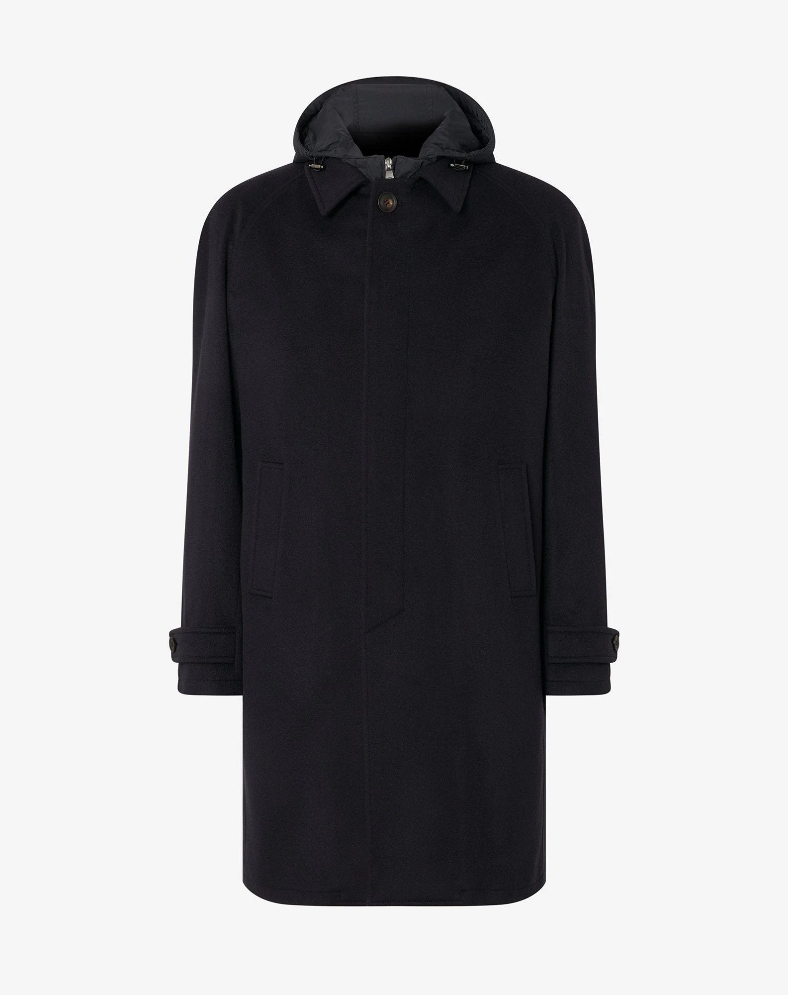 A garment designed to face the cold season with refinement and versatility. This single-breasted pure virgin wool coat is enriched with a practical nylon inner vest with detachable hood, to adapt to any style and functionality need. The raglan sleeve construction ensures a regular fit and impeccable comfort, while the shirt collar and side slant pockets evoke a sober and contemporary elegance. The quilted interior ensures warmth and lightness, while the adjustable straps at the bottom of the sleeves add a distinctive tailored detail. A coat Made in Italy to stand out for its balance and attention to detail. DETAILS AND MATERIALS - 100% virgin wool - single breasted coat with detachable hooded nylon inner vest - drop 7 - regular fit - raglan sleeves - shirt collar - slanted side pockets - quilted interior - adjustable straps at the cuff - length 100 cm - Made in Italy FIT & WASHING - Dry clean with perchloroethylene, do not bleach, do not tumble dry, maximum iron temperature 110°