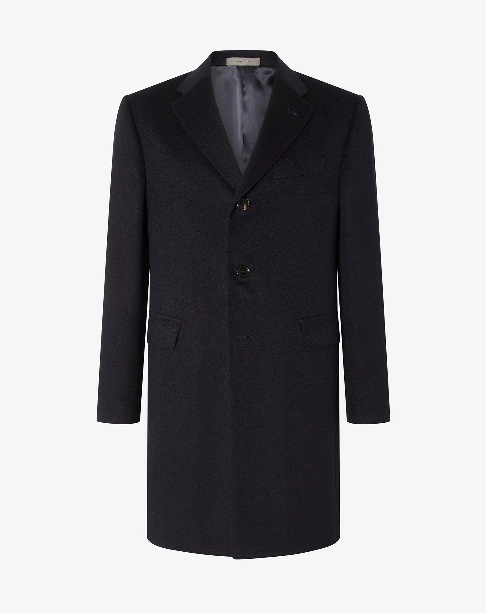 Crafted from a fine pure virgin wool beaver, this blue coat is pure, essential and timeless elegance. The lightweight shoulder construction, smooth satin lining and AMF stitching at the edge finish this garment with a regular fit and natural comfort. The notch lapels, side flap pockets and real horn buttons convey an authentic sartorial aesthetic, while the overlapping buttons on the sleeves emphasise the attention to detail. Made entirely in Italy, this is a versatile coat, ideal to accompany the winter season with ease. DETAILS AND MATERIALS - 100% virgin wool - 3-button single-breasted pure wool beaver coat - lined - regular fit - drop 7 - AMF stitching at the edge - light shoulder construction - notch lapels - breast pocket - patch side pockets - smooth satin lining - horn buttons - overlapping buttons on sleeves - width 95 cm - Made in Italy FIT & WASHING - This garment has a regular fit. The model is wearing a size 50 (IT). Model’s measurements: height 187cm, chest 98cm, waist 82cm, hips 98cm. Dry clean with perchloroethylene, do not bleach, do not tumble dry, maximum iron temperature 110°