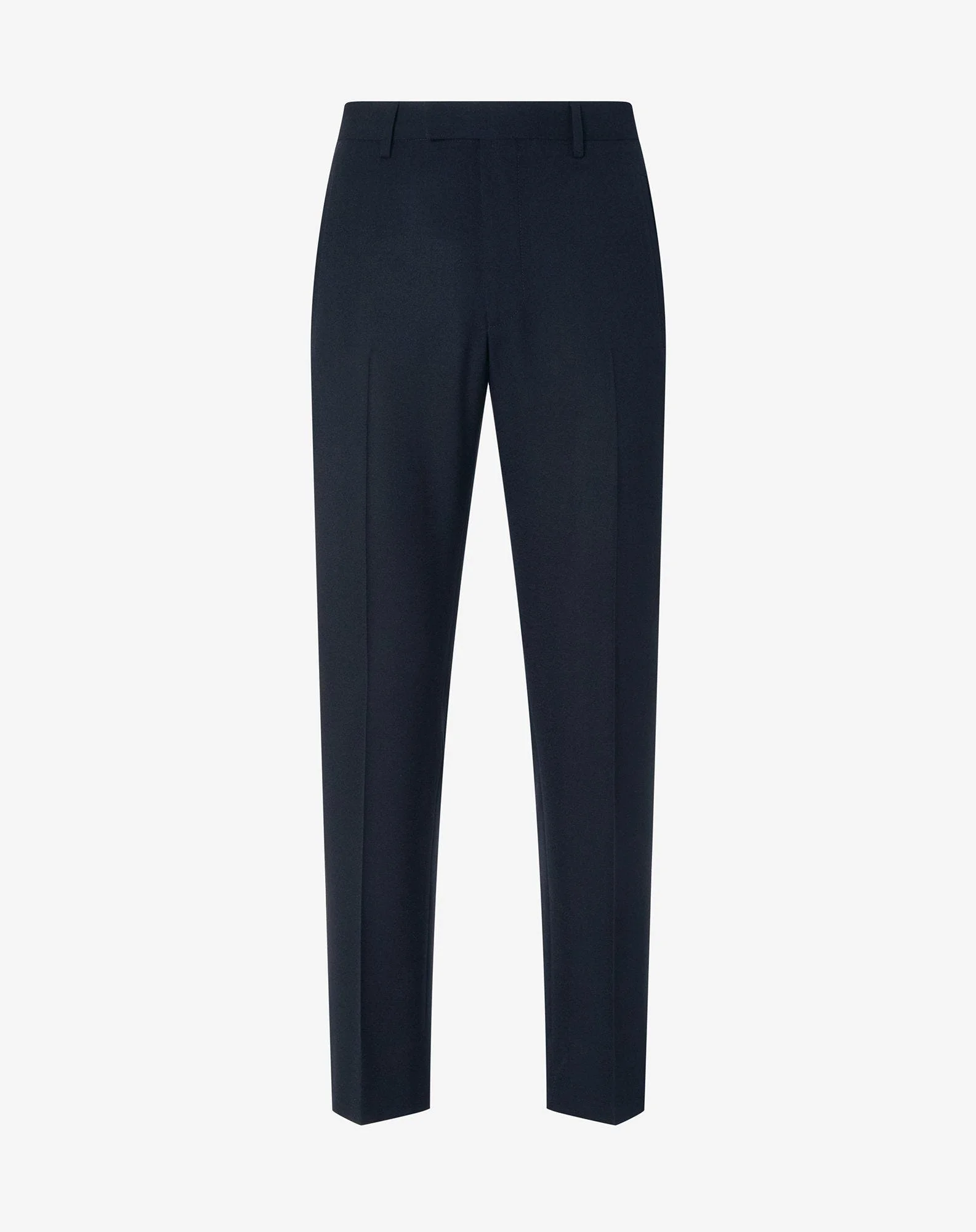 Blue pure virgin wool chino trousers, pure contemporary elegance with everyday comfort. The regular fit and drop 7 ensure balanced lines, while the flat front enhances their minimalist design. The perfect fit is achieved through an extension with hook button at the waist and a waistband with zip for optimal comfort. The classic leg bottom (19 cm) confirms the versatile and sophisticated fit. Unlined, lightweight and breathable: the ideal garment for those looking for sartorial quality and timeless style. DETAILS AND MATERIALS - 100% virgin wool - flat front chino trousers - unlined - drop 7 - regular fit - extendible belt with hook button - zip and waistband closure - belt loops - hemmed vertical side pockets - welt back pockets - bottom width 19 cm FIT & WASHING - Dry clean with perchloroethylene, do not bleach, do not tumble dry, maximum iron temperature 110°